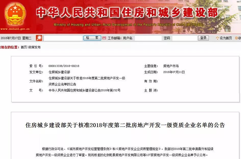 住房城乡建设部官网7月17日消息,根据行政许可法、《城市房地产开发经营管理条例》和《房地产开发企业资质管理规定》,住建部对2018年第二批申请晋升和延续房地产开发一级资质企业进行了审查。并将核准的北京乾景房地产开发有限公司等127家房地产开发一级资质企业名单予以公布。